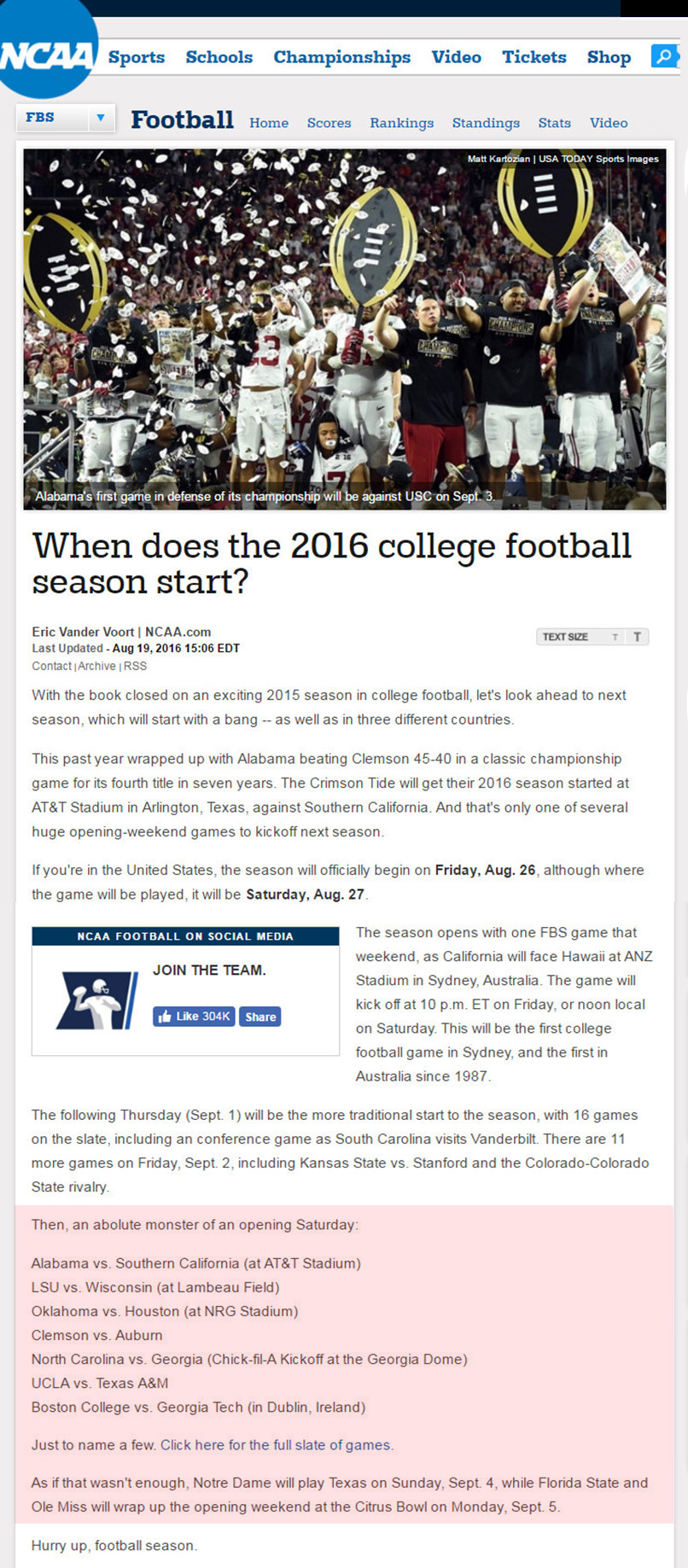 This has to be the best opening week of College Football in my memory! 10 days of great match-ups, including a Sunday and Monday game. Get the junk off your VCR's....I mean, DVR's and make some space for these important games below!